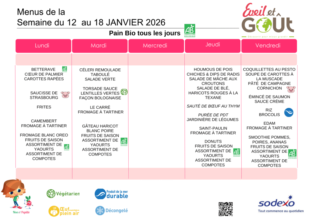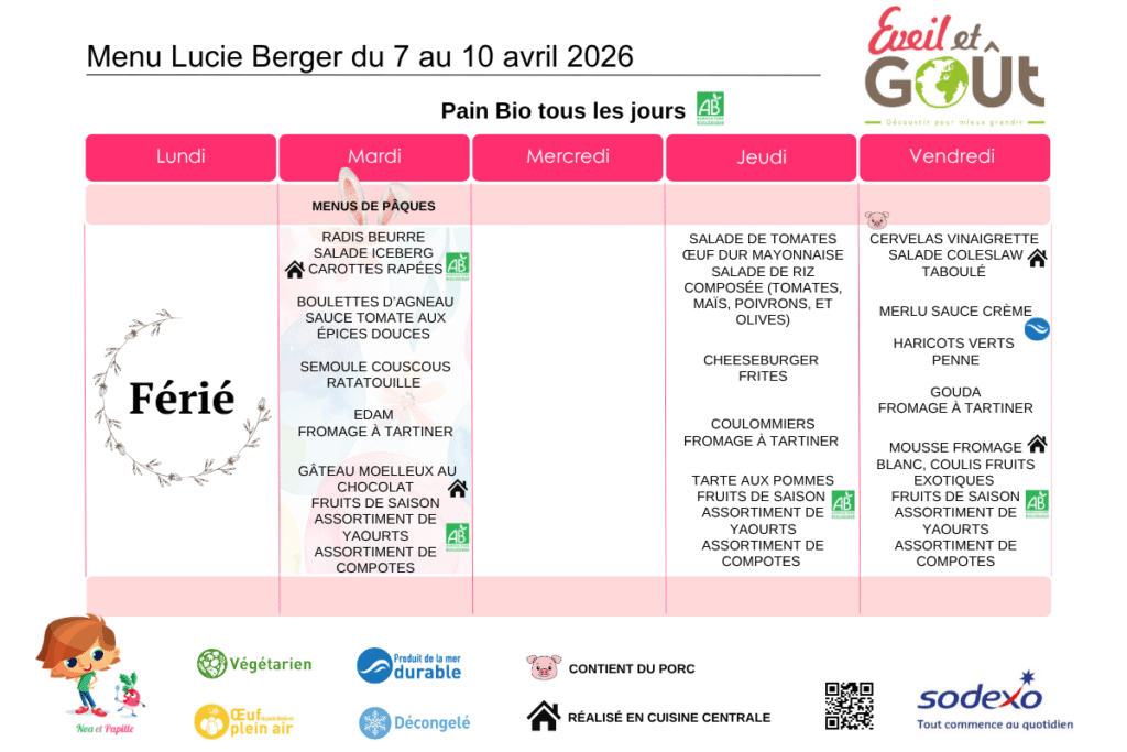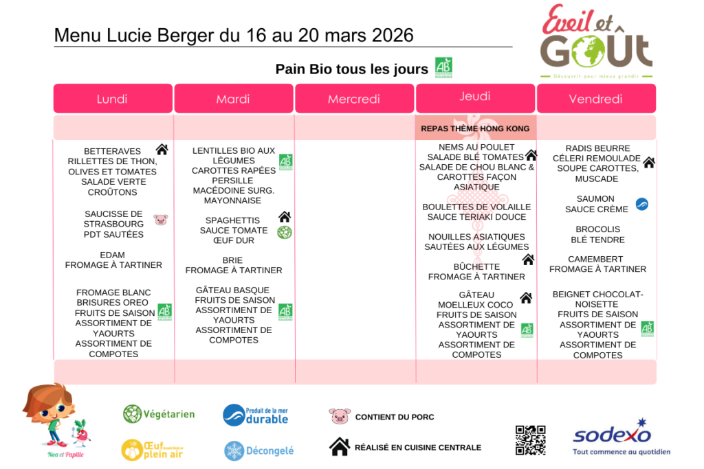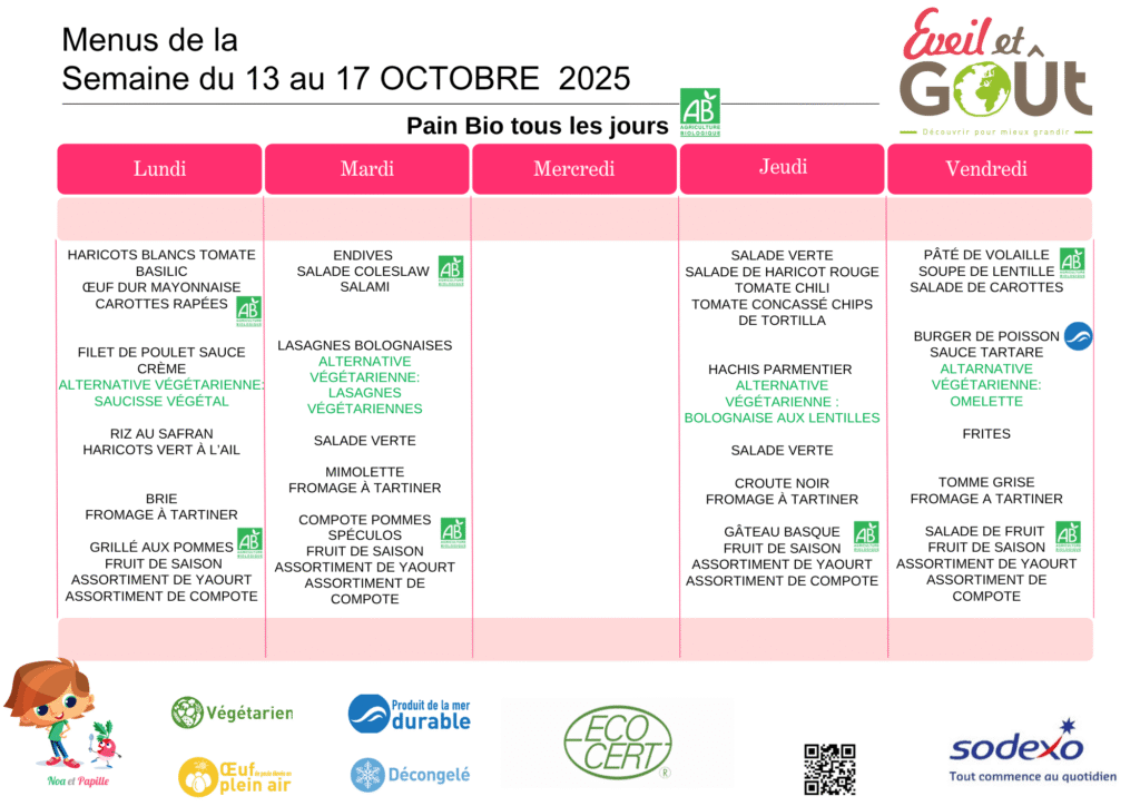 L’engagement de l’établissement et de la société Sodexo est de proposer aux enfants un menu équilibré, répondant à leurs attentes en termes de choix, et dont la qualité et la composition des repas sont réévaluées mensuellement en réunion de restauration.