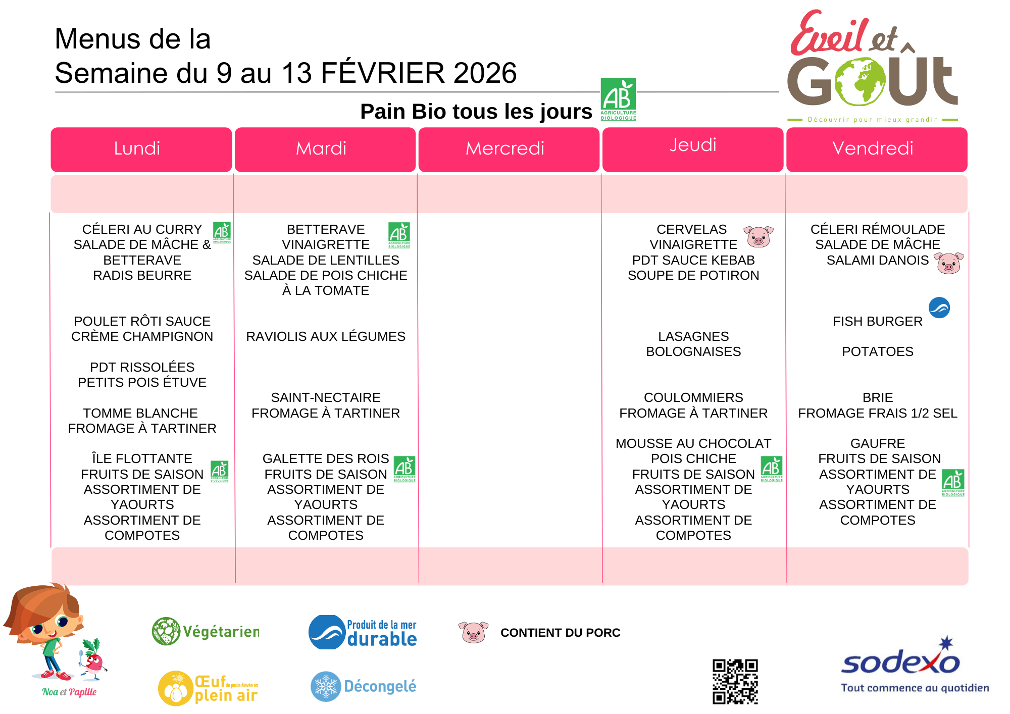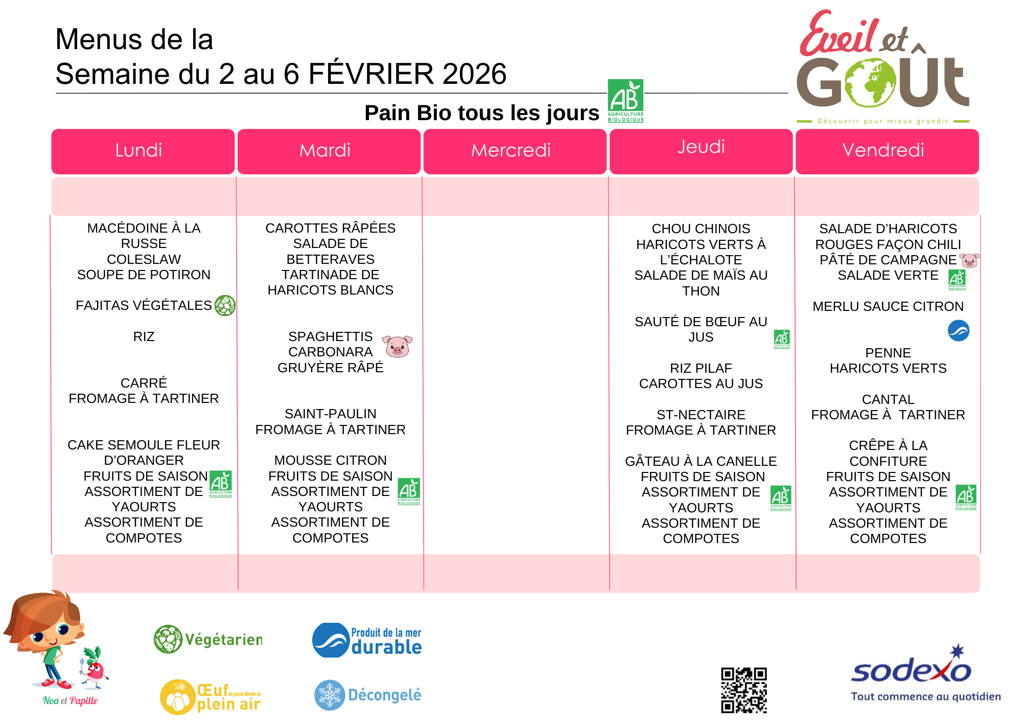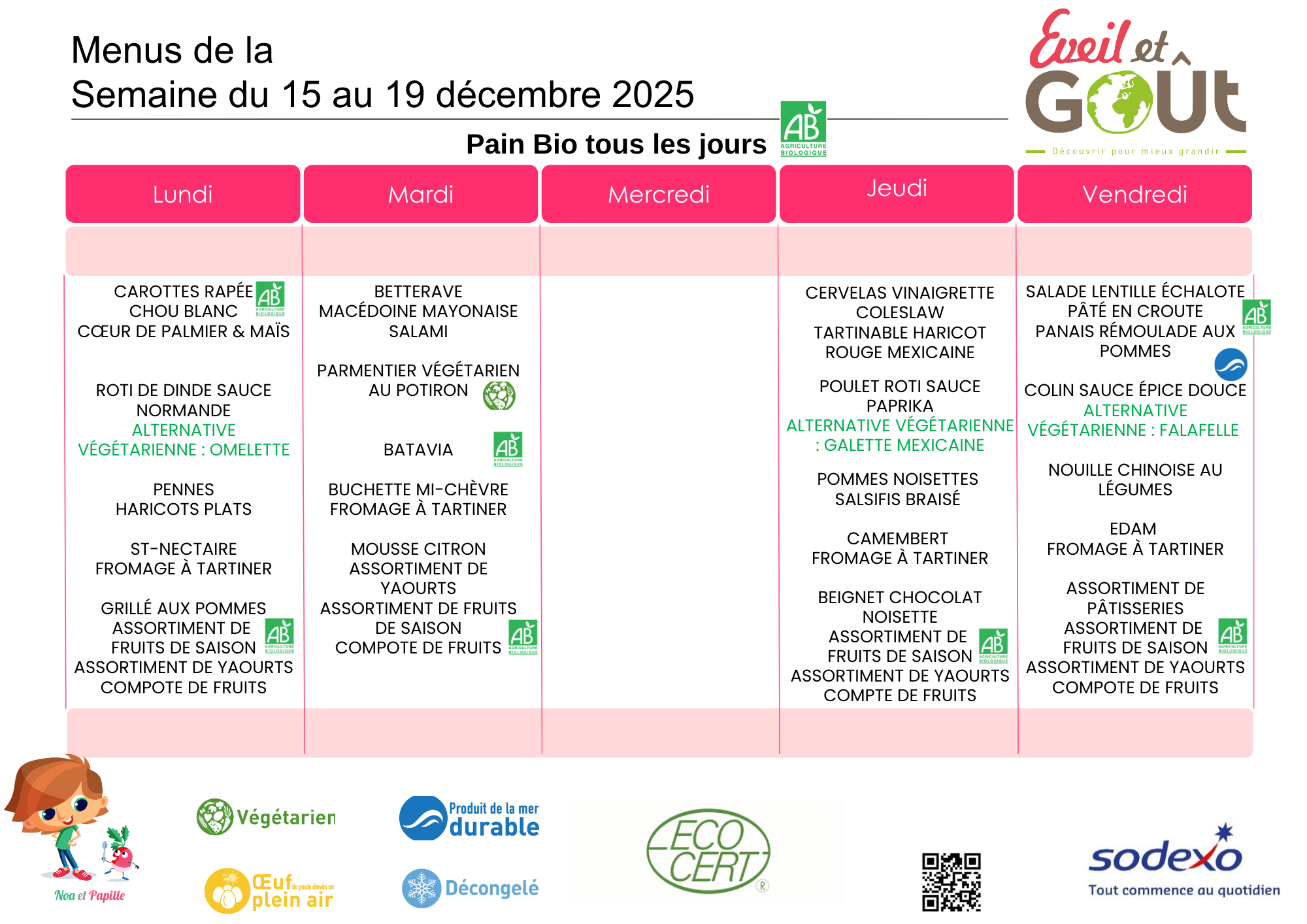 L’engagement de l’établissement et de la société Sodexo est de proposer aux enfants un menu équilibré, répondant à leurs attentes en termes de choix, et dont la qualité et la composition des repas sont réévaluées mensuellement en réunion de restauration.