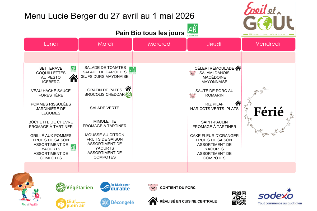L’engagement de l’établissement et de la société Sodexo est de proposer aux enfants un menu équilibré, répondant à leurs attentes en termes de choix, et dont la qualité et la composition des repas sont réévaluées mensuellement en réunion de restauration.